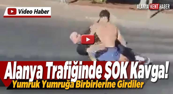 Alanya'da iki kişi akan trafiğe aldırış etmeden yol ortasında yumruk yumruğa kavgaya tutuştu.