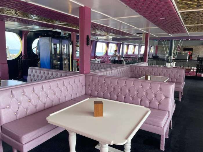 Devasa görünümüyle görenleri hayretler içerisinde bırakan teknenin iç kısmı da 5 yıldızlı otelleri aratmıyor. Kafe, restoran, bar ve diskonun yanı sıra tur teknesinde çocuklar için oyun grupları da bulunuyor.