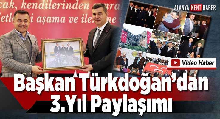 Sosyal medya üzerinden yayınladığı mesajda Cumhur İttifakı ruhuyla emek ve mücadele veren, samimiyetle yüreklerini ortaya koyan herkese teşekkür eden, Başkan Türkdoğan; "31 Mart 2019 mahalli idareler seçimlerinde, Liderimiz Sayın Devlet Bahçeli’nin bizlere emaneti olan Üç hilalli sancağımızı Alanya Kalesi'nin burçlarında bir dönem daha dalgalandırdığımız seçim zaferimizin 3. yıldönümü kutlu olsun.Cumhur İttifakı ruhuyla emek ve mücadele veren, samimiyetle yüreklerini ortaya koyan herkese teşekkür ve şükranlarımı sunuyorum..." dedi.