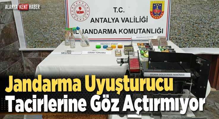 Antalya Valiliği İl Jandarma Komutanlığı ekiplerinin uyuşturucu madde imal ve ticaretine yönelik çalışmaları tüm hızıyla devam ediyor. Bu çerçevede Antalya İl Jandarma Komutanlığı KOM Şube Müdürlüğü ve Kepez İlçe Jandarma Komutanlığı ekipleri tarafından bir operasyon düzenlendi. İki şüpheli şahsın Kepez ilçesinde bulunan ikametlerinde arama yapıldı. Yapılan aramada; 10 gram skunk, 20 adet sentetik hap, 4 gram kenevir tohumu, 4 adet esrar öğütücüsü, 30 paket doldurulmuş bandrolsüz makaron, 5 kg işlenmemiş tütün, 300 adet boş makaron, 1 adet sigara dolum makinesinin ele geçirildi.