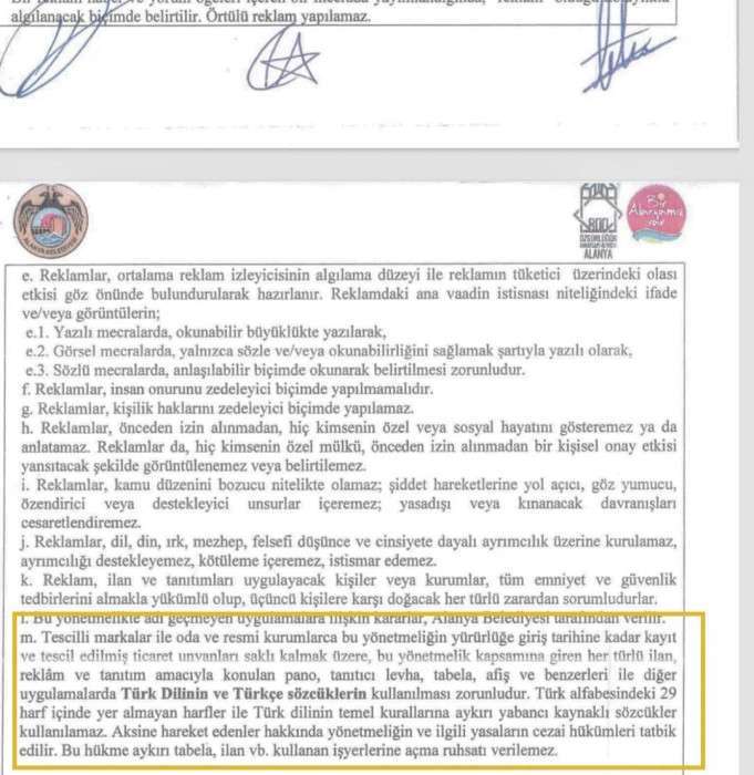 Konuyu Alanya Belediye Başkanı Adem Murat Yücel'e ve zabıta ekiplerine ileten Bağışlar, bahse konu yabancı dilde tabela asmış işletmelerin belediye ekiplerince gerekli uyarılarının yapıldığını belirterek, en kısa süre içerisinde Alanya Belediye Meclis kararı gereği, İlan ve Reklam Yönetmeliği'ne uygun hale getirileceğini aktardı.